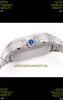 Diamonds Embedded Dial with Arabic Hour Numerals, Date Window at 6 O'Clock and Signature Cartier Markings at the 7 O'Clock Counter. Blue Sapphires on Stem Tip