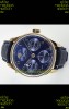 Blue Dial with Functional Monophase indicator working as 12/24 hours counter, Functional Date, Functional Month, Functional Day of Week, Functional Year Indicators