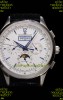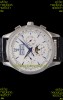 White Dial with Day/Date Indicator at 12 O'Clock, Date Counter, Day of Week Counter and 12/24 hours counter with Day and night Moon Phase Indicator.