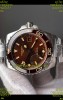 Brown dial with Superlumed Hour Markers and Bi-Directional Rotating Bezel. Functional Fourth GMT Hand.