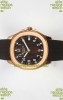 Brown Curved Rubber Strap with Rose Gold Plating on Steel Folding Clasp complete with Patek Philippe Markings. A Highly Updated Clasps for this series with much more accurate markings/engravings.