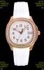 White Colored Textured Dial with Date Window at 3 O'Clock. Diamonds Bezel
