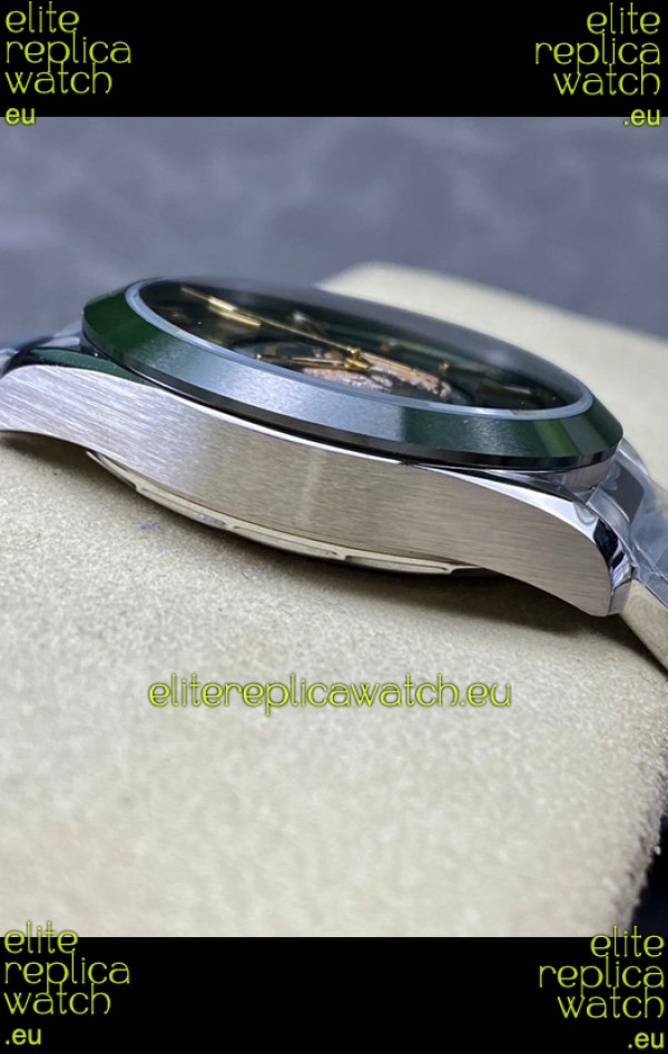 Genuine Swiss Movement assembled to resemble the Original Omega Cal 8938 Movement. Platinum Plated Rotor and heaviliy detailed movement details matching the originals