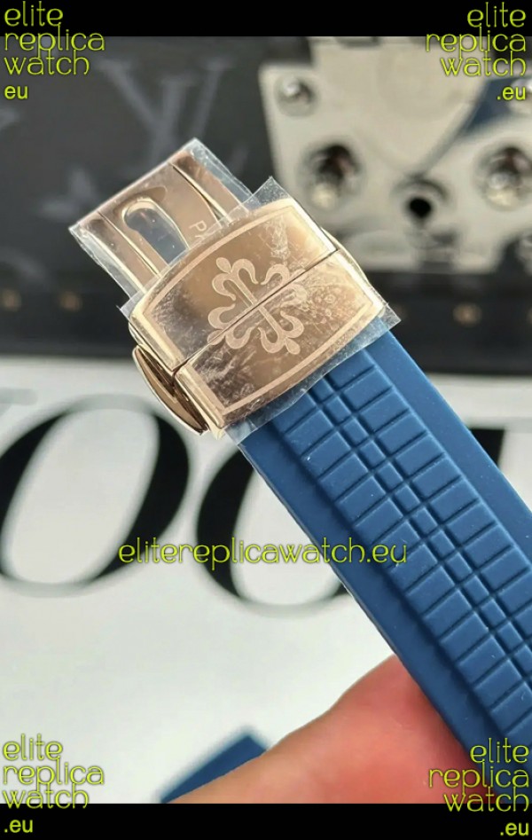 Blue Curved Rubber Strap with Steel Folding Clasp complete with Patek Philippe Markings. A Highly Updated Clasps for this series with much more accurate markings/engravings.