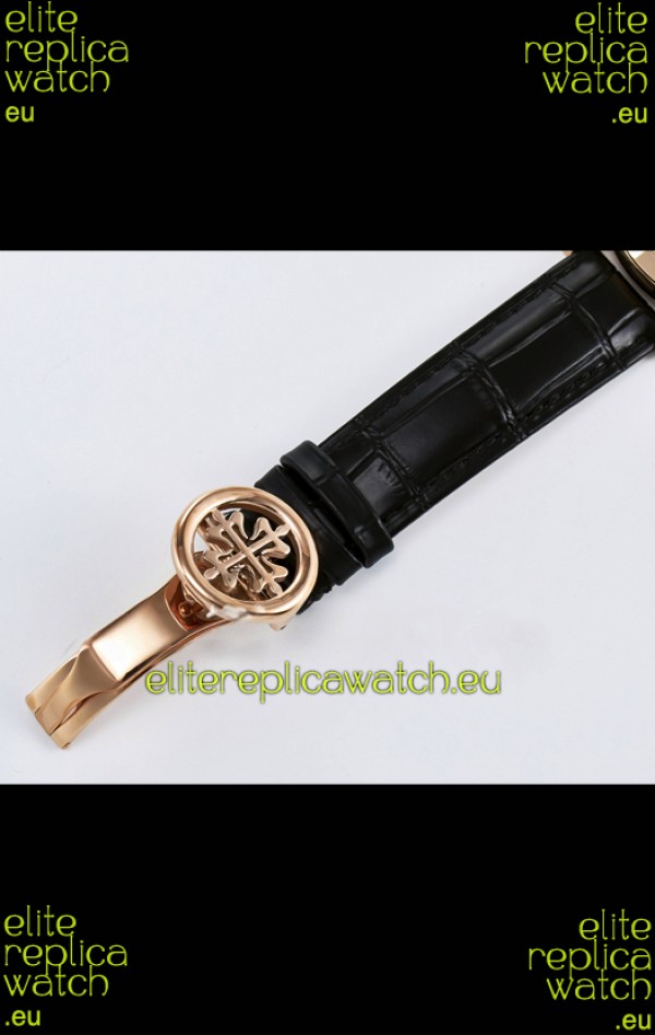 Genuine Swiss 9015 Movement assembled to Resemble the Authentic Patek Philippe PP 324 Calibre Style Movement. Updated Rotor, Bridged and Engravings on Movement with Rose Gold Plated Patek Philippe Stamped Rotor