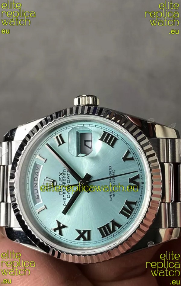 Rolex Day Date Super Clone Stainless Steel Ice Blue Dial Roman Numerals Watch 36MM - 1:1 Mirror Quality