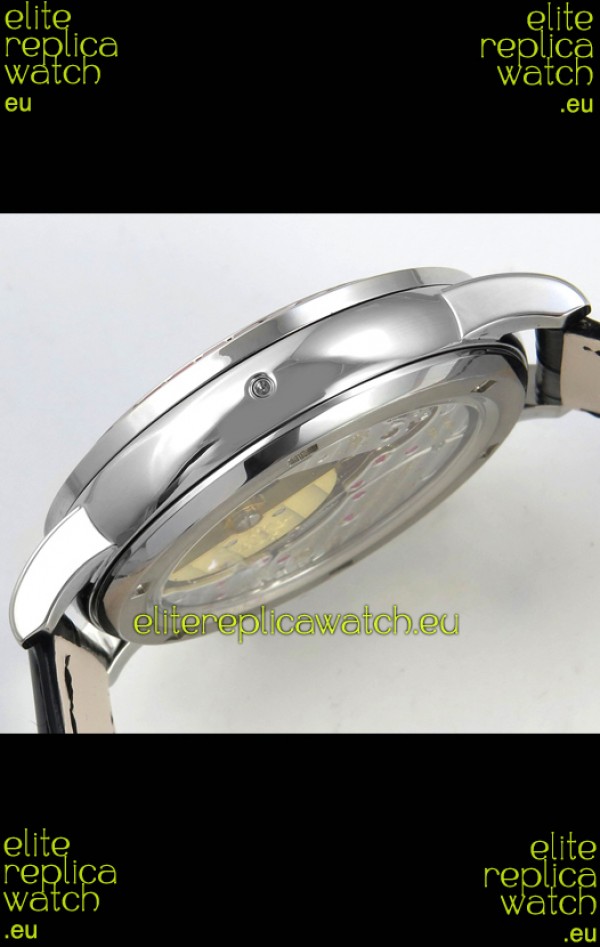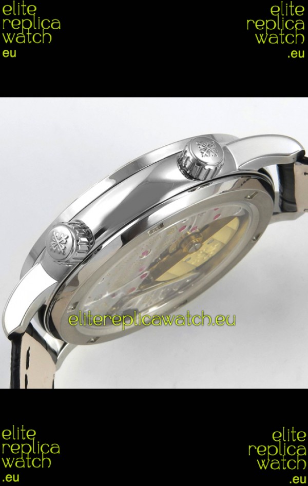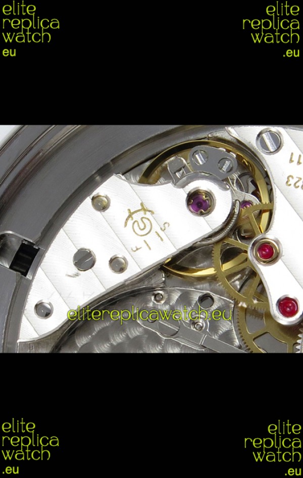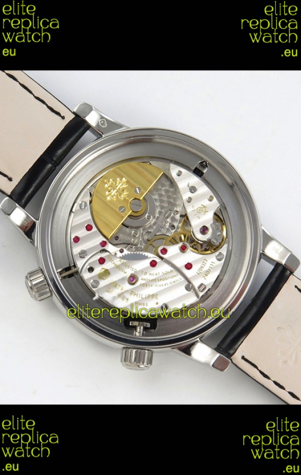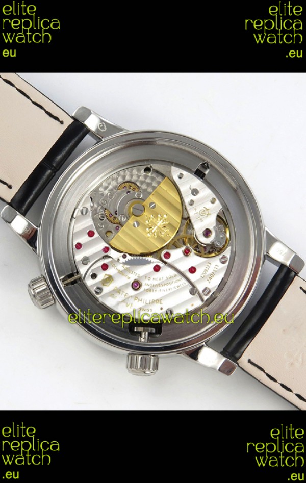 Genuine Swiss 9015 Movement assembled to Resemble the Authentic Patek Philippe PP 240 Calibre Style Movement. Updated Rotor, Bridged and Engravings on Movement with Rose Gold Plated Patek Philippe Stamped Rotor