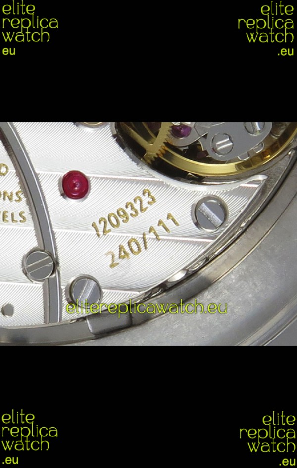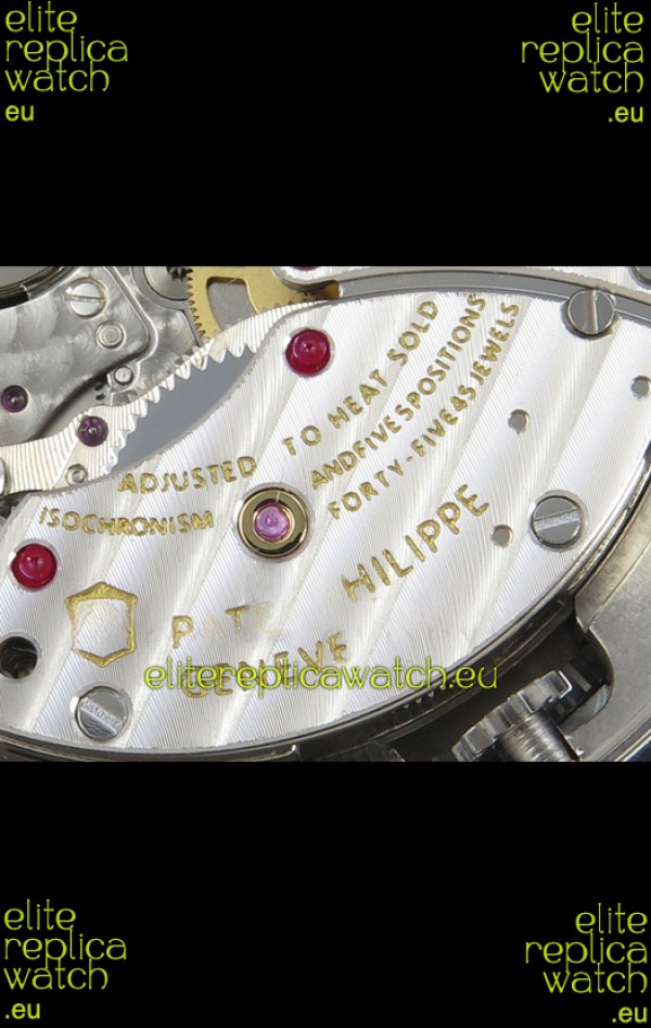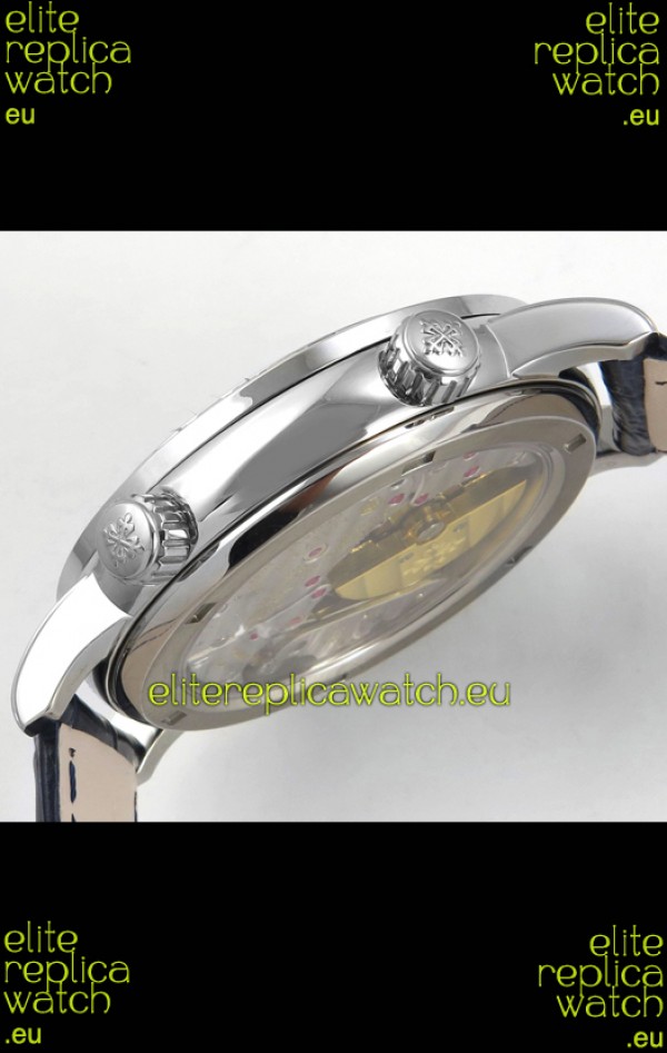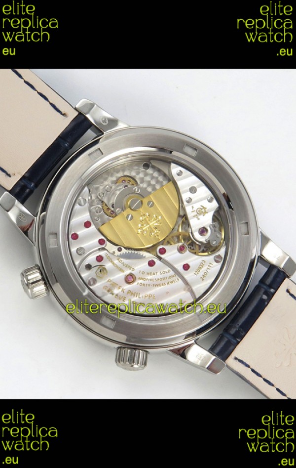 Genuine Swiss 9015 Movement assembled to Resemble the Authentic Patek Philippe PP 240 Calibre Style Movement. Updated Rotor, Bridged and Engravings on Movement with Rose Gold Plated Patek Philippe Stamped Rotor