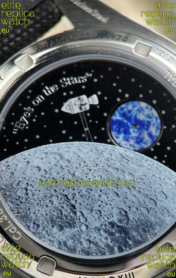 The Globe Located at the rear would rotate and complete one revolution per Minute, the Snoopy on Spaceship would rotate counter clockwise in conjunction to the Chronograph second hand once the Chronograph feature is activated.