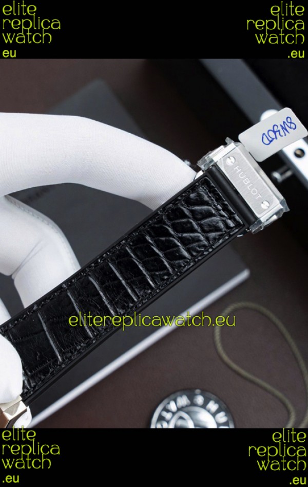 Hybrid Leather/Rubber Strap with Stainless Steel Folding Clasp complete with Hublot Markings and Engravings.