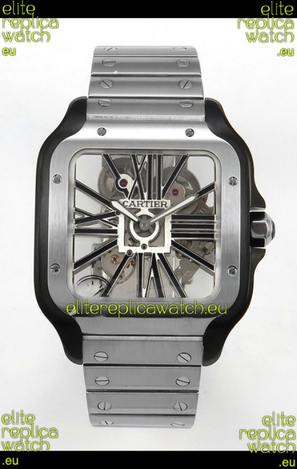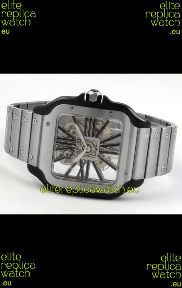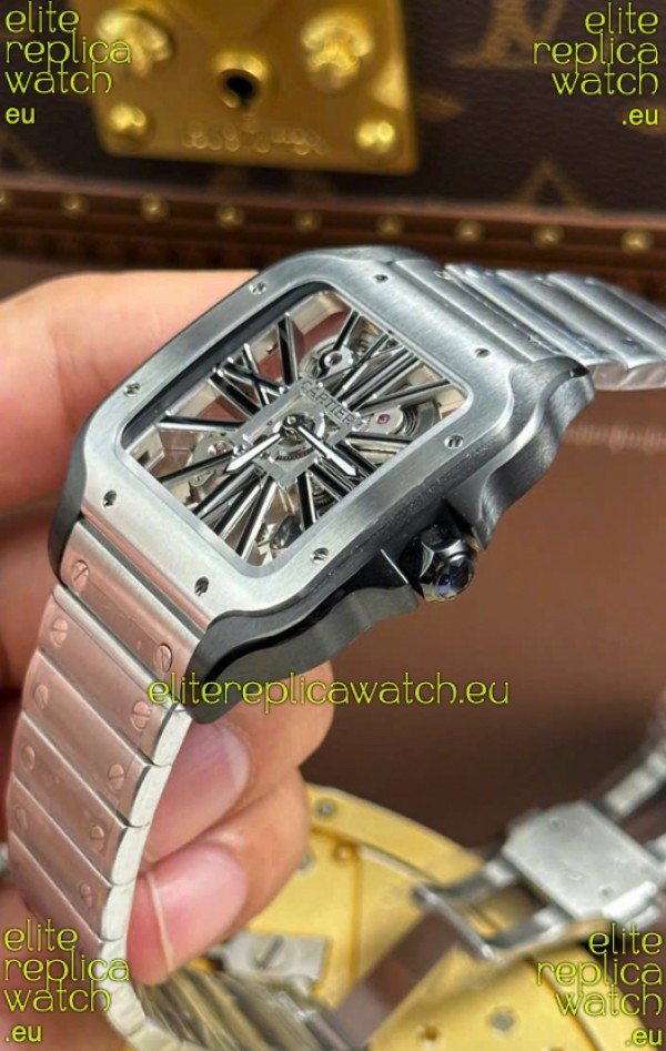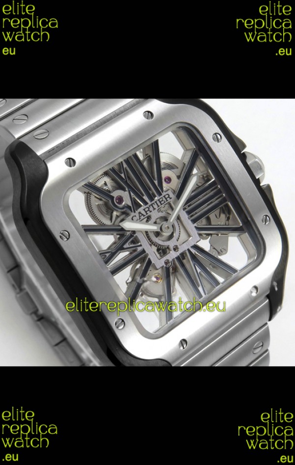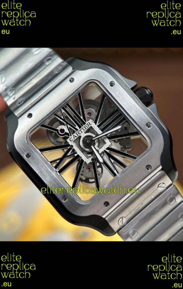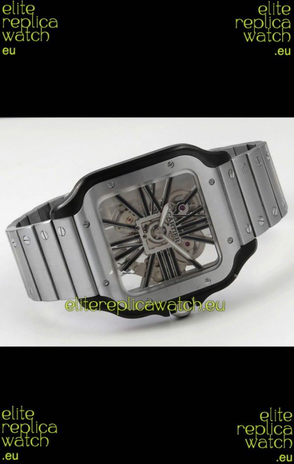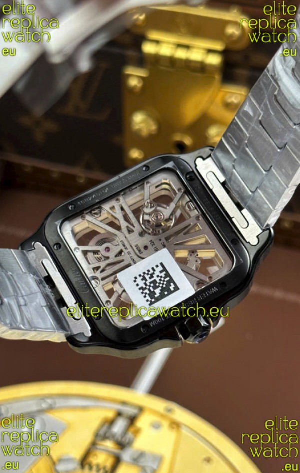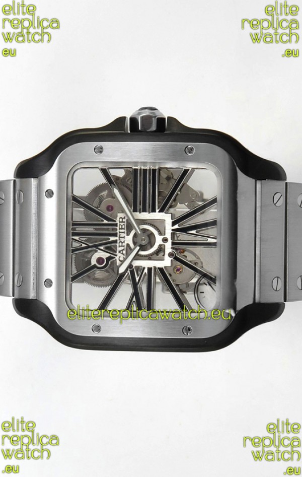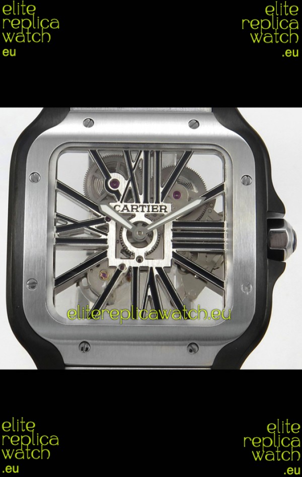 Santos De Cartier Super Clone Watch in Skeleton Dial Brushed DLC Coated Steel Casing Watch