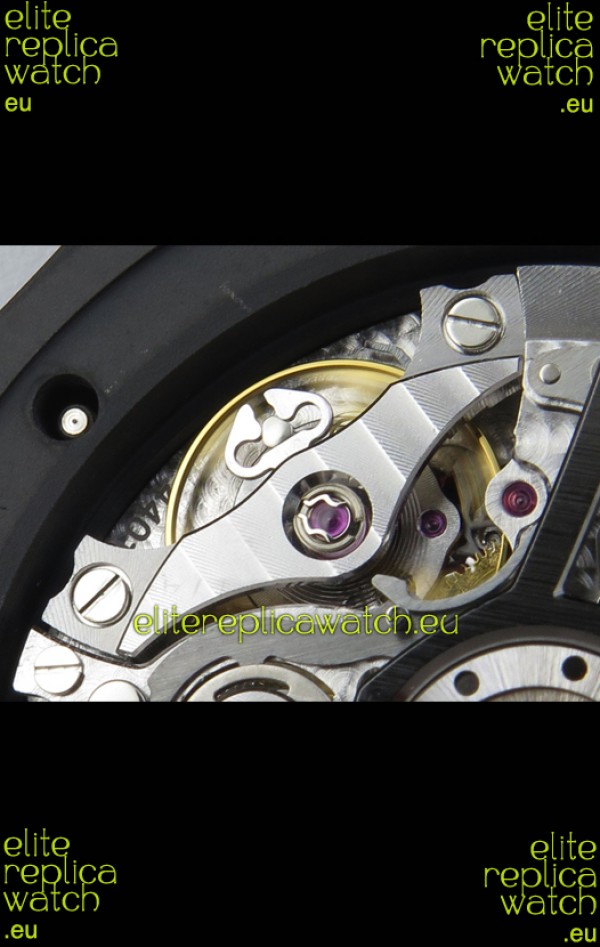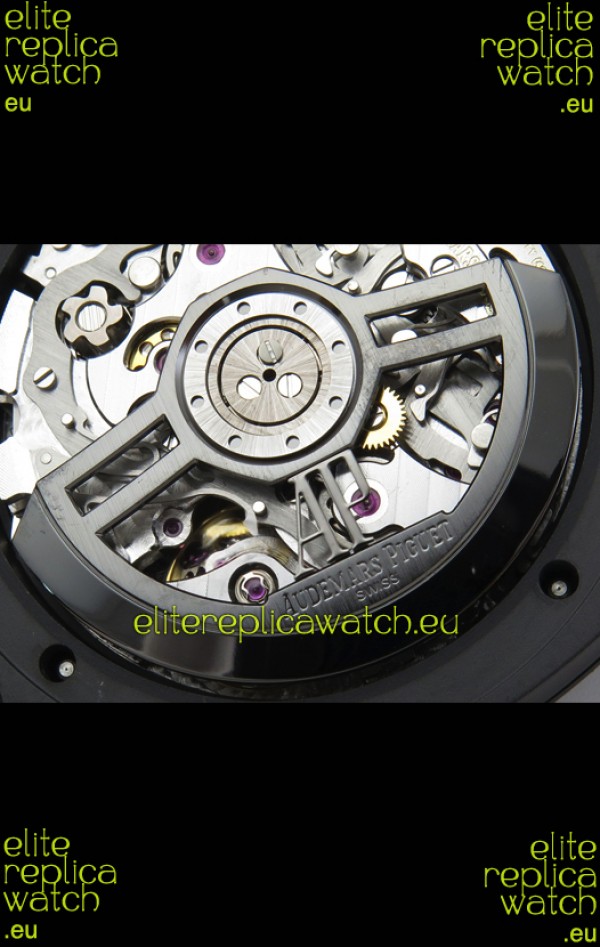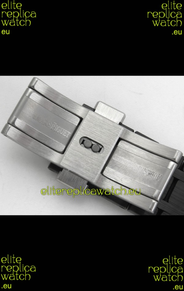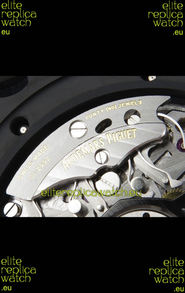 Machinery Layout exactly like Audemars Piguet 3126 Calibre Movement used in Authentic Audemars Piguet Offshore Watches. Built on Genuine Swiss 7753 Movement architecture with Functional stopwatch feature like the authentic with Seconds hand running at the 12 o clock Sub Dial