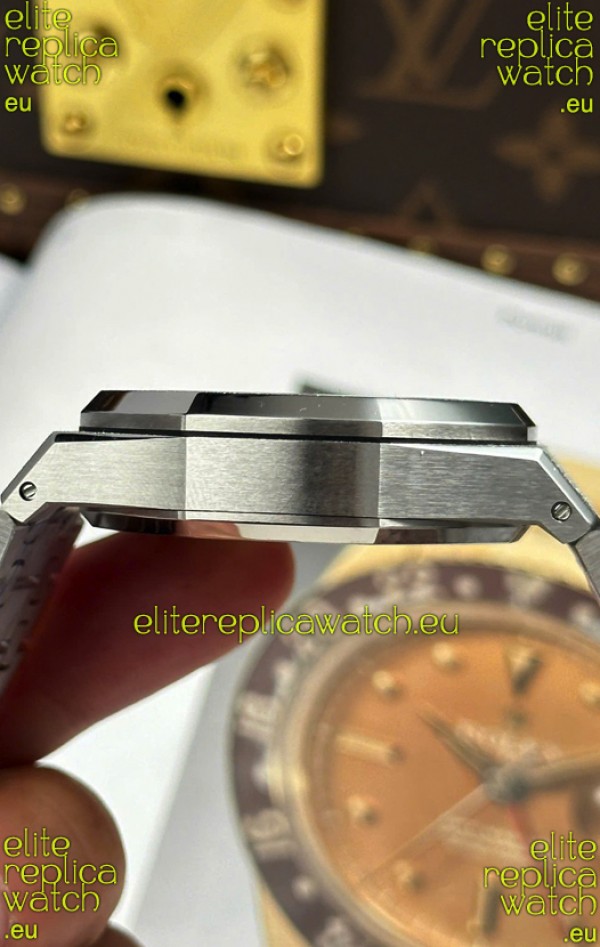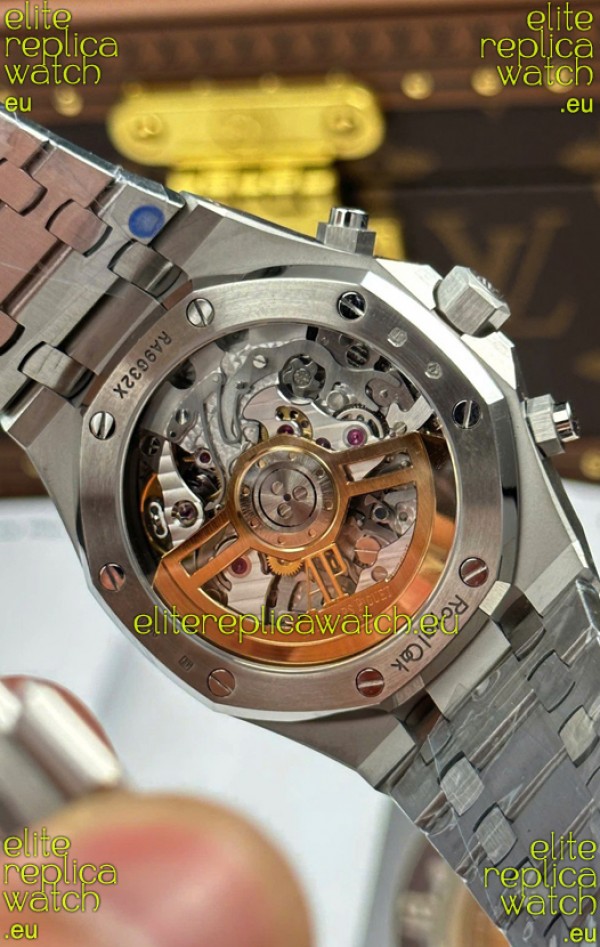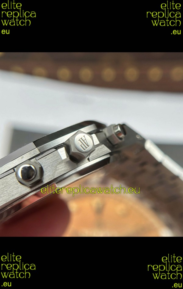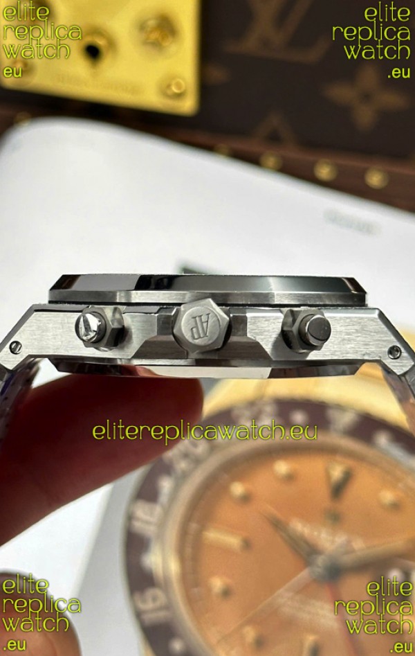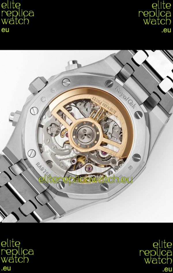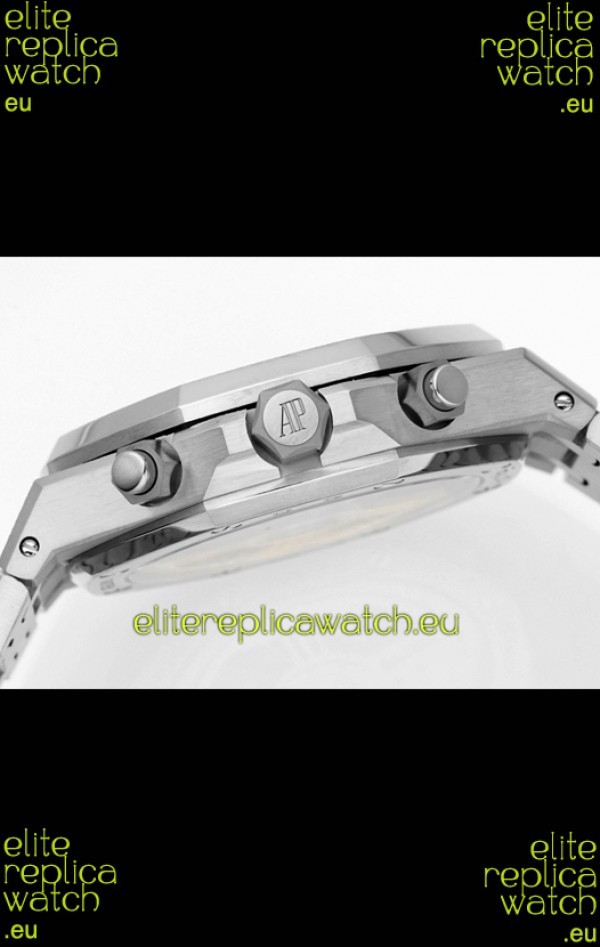 Machinery Layout exactly like Audemars Piguet 4401 Calibre Movement used in Authentic Audemars Piguet Offshore Watches. Built on Genuine Swiss 7753 Movement architecture with Functional stopwatch feature like the authentic with Seconds hand running at the 12 o clock Sub Dial