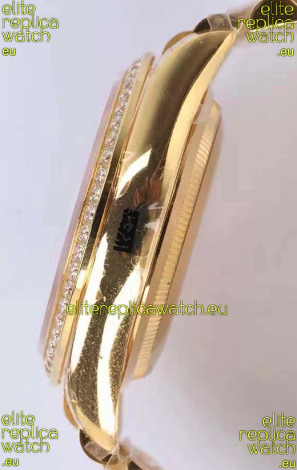 18K Yellow Gold Plating on 904L Stainless Steel New Design President Strap encrusted with Swiss Cut Diamonds with Folding Clasps complete with Rolex Markings and Engravings