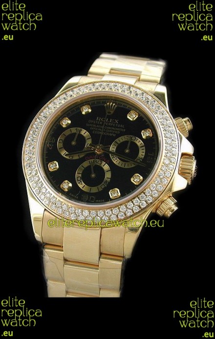 Rolex Daytona Swiss Replica Gold Watch in Full Diamond Bezel